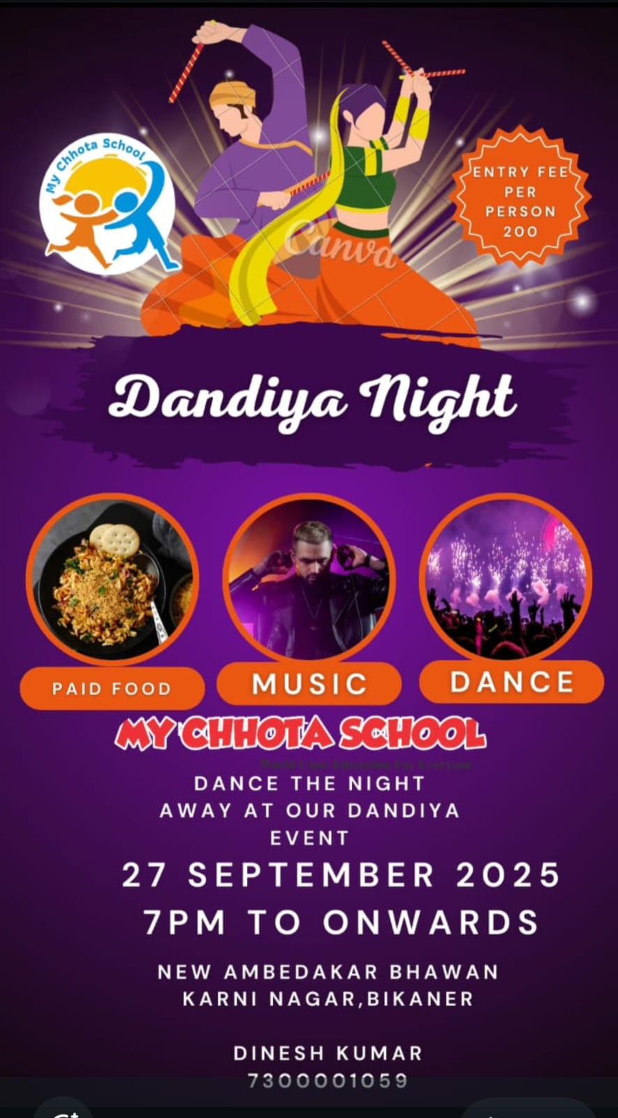 ***बीकानेर, 26 सितंबर 2025:* “माय छोटा स्कूल” द्वारा शारदीय नवरात्रि के उत्सव को धूमधाम से मनाने के लिए 27 सितंबर 2025 को डांडिया नाइट का आयोजन किया जा रहा है। यह कार्यक्रम शाम 7 बजे से न्यू अंबेडकर भवन, करणी नगर, बीकानेर में आयोजित होगा।प्रवेश शुल्क प्रति व्यक्ति 200 रुपये निर्धारित किया गया है। आयोजन में भुगतान पर भोजन, लाइव संगीत और पारंपरिक डांडिया डांस का आनंद लिया जा सकेगा। इस दौरान प्रतिभागी स्वादिष्ट भोजन, मंत्रमुग्ध कर देने वाले संगीत और जोशीले नृत्य का लुत्फ उठा सकेंगे। डांडिया नाईट मे प्रवेश हेतु कार्यक्रम संयोजक दिनेश कुमार से उनके दूरभाष नंबर 7300001059 पर सीधे सम्पर्क किया जा सकता है।