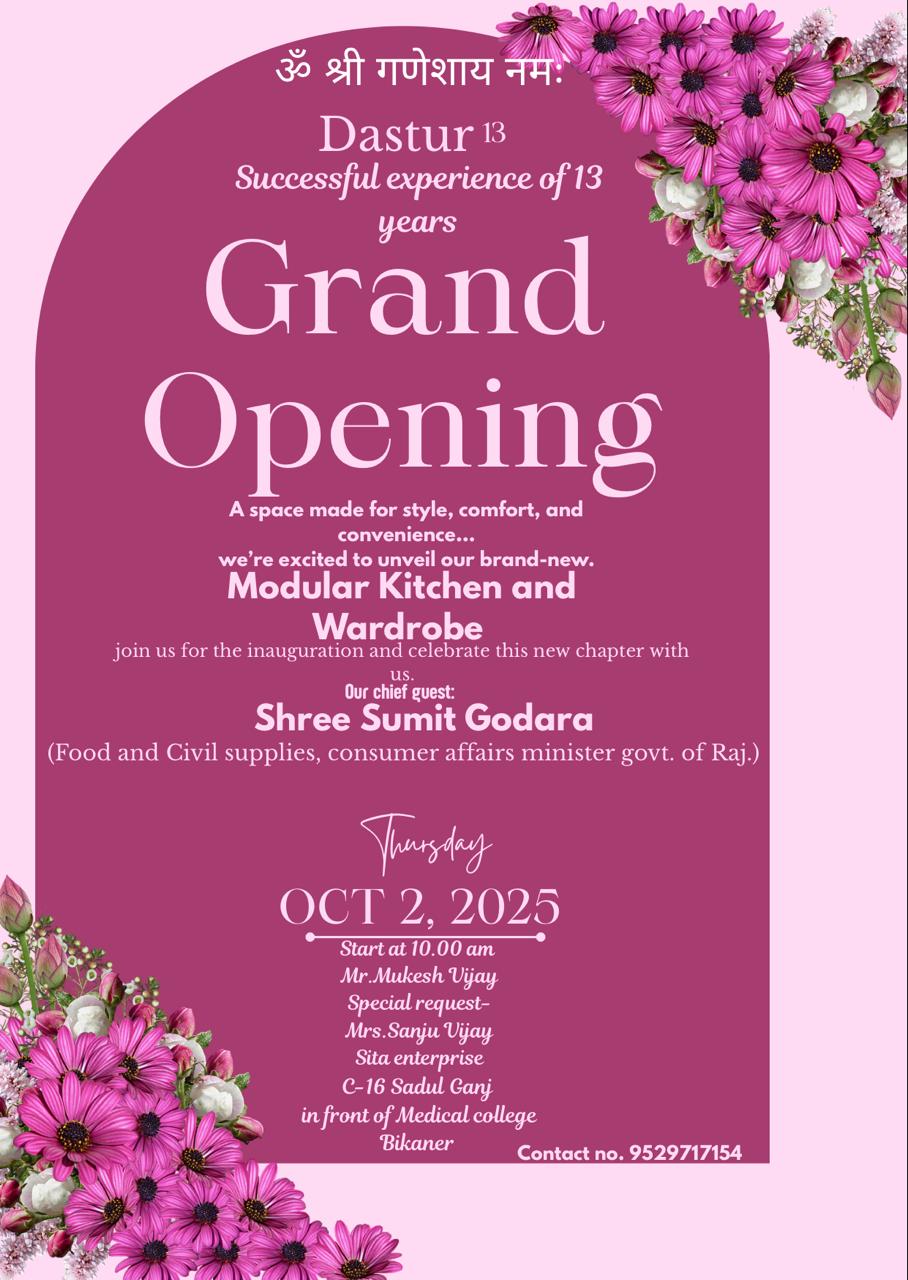 फर्म का शुभारंभ 2 अक्टूबर 2025 को होगा, जिसमें विशेष तौर पर मॉड्यूलर किचन और वार्डरोब की आधुनिक सुविधाएँ उपलब्ध कराई जाएँगी।