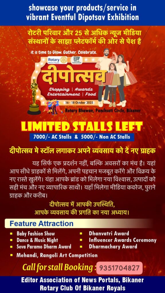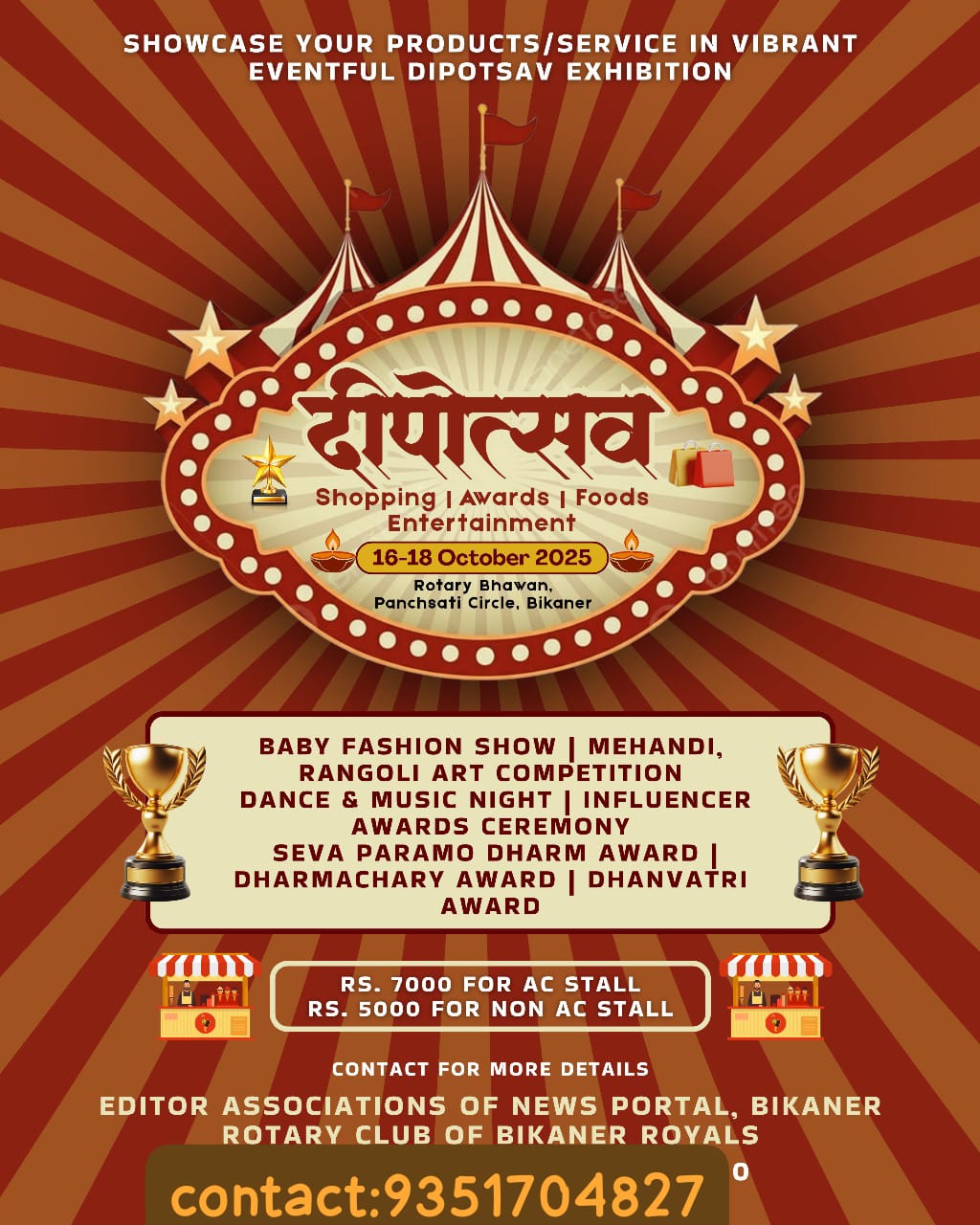 बीकानेर, 5 अक्टूबर । रोशनी और उमंग का पर्व दीपावली इस बार बीकानेर में एक नए रंग-रूप के साथ मनाया जाएगा। एडिटर एसोसिएशन ऑफ न्यूज पोर्टल्स बीकानेर और रोटरी क्लब बीकानेर रॉयल्स के संयुक्त तत्वावधान में 16 से 18 अक्टूबर तक रोटरी भवन, पंचशती सर्किल, सादुलगंज में तीन दिवसीय दीपोत्सव कार्यकर्म का आयोजन किया जा रहा है। दीपोत्सव के तहत खरीददारी, सम्मान समारोह, और मनोरंजन के कार्यक्रमों को त्रिवेणी के रूप मे आयोजित किया जा रहा जिससे हर वर्ग अपने अंदाज़ मे दीपोत्सव मना सके. यह आयोजन केवल खरीदारी और मनोरंजन का मेला नहीं होगा, बल्कि इसमें संस्कृति, साहित्य, सेवा और सम्मान की अनूठी छटा भी देखने को मिलेगी।