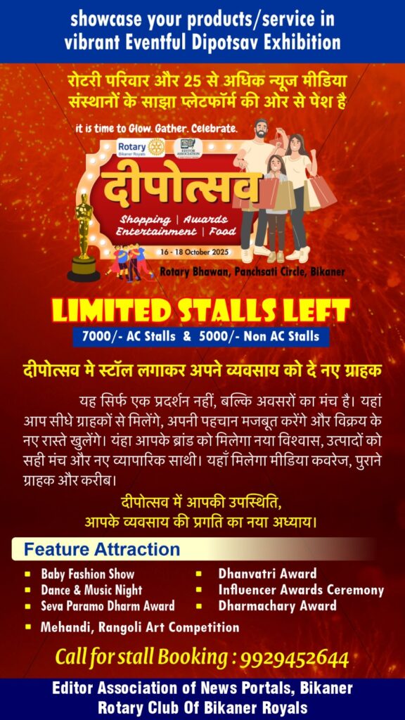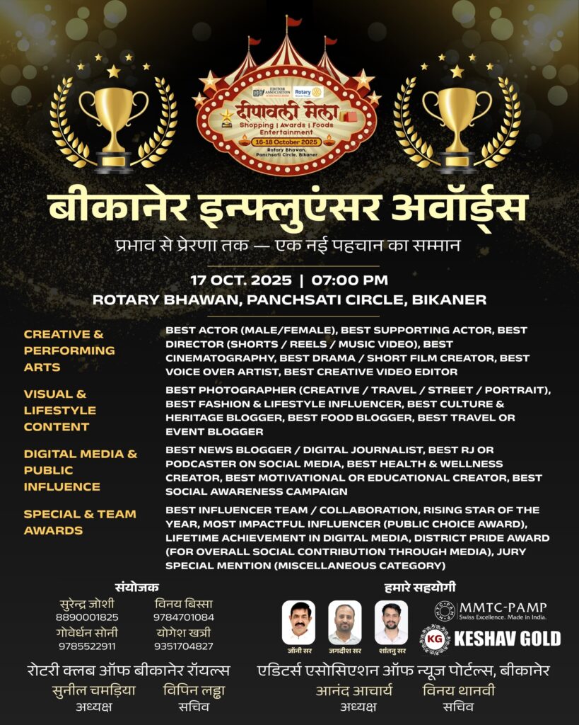 बीकानेर, 11 अक्टूबर। बीकानेर जैसे सांस्कृतिक और रचनात्मक शहर में आज अनेक युवा सोशल मीडिया और डिजिटल प्लेटफॉर्म के माध्यम से अपनी प्रतिभा का प्रदर्शन कर रहे हैं। ब्लॉगिंग, रील्स, वीडियो कंटेंट और ऑनलाइन क्रिएशन के जरिए ये युवा न केवल अपनी पहचान बना रहे हैं, बल्कि शहर की संस्कृति, समाज और व्यवसाय से भी गहराई से जुड़े हुए हैं। इन्हीं डिजिटल क्रिएटर्स को प्रोत्साहित करने और सम्मानित करने के उद्देश्य से बीकानेर में पहली बार “इन्फ्लुएंसर अवॉर्ड नाइट” का आयोजन किया जा रहा है।इस आयोजन के संयोजक रोटेरियन सुरेंद्र जोशी ने बताया कि यह कार्यक्रम रोटरी क्लब बीकानेर रॉयल्स एवं एडिटर एसोसिएशन ऑफ न्यूज पोर्टल्स के संयुक्त तत्वावधान में आयोजित होगा। यह अवॉर्ड नाइट 17 अक्टूबर को सायं 7 बजे रोटरी भवन, पंचशती सर्कल, बीकानेर में आयोजित की जाएगी। इस अवसर पर विभिन्न श्रेणियों में सक्रिय डिजिटल इन्फ्लुएंसरों को सम्मानित किया जाएगा, जिन्होंने अपने कंटेंट के माध्यम से समाज पर सकारात्मक प्रभाव डाला है और बीकानेर की डिजिटल पहचान को नई ऊंचाइयों तक पहुंचाया है।एडिटर एसोसिएशन के उपाध्यक्ष योगेश खत्री ने बताया कि इच्छुक इन्फ्लुएंसर या डिजिटल क्रिएटर निम्न श्रेणियों में आवेदन कर सकते हैं —बेस्ट एक्टर, बेस्ट सपोर्टिंग एक्टर, बेस्ट डायरेक्टर (शॉर्ट्स/रील/म्यूजिक वीडियो), बेस्ट सिनेमैटोग्राफी, बेस्ट ड्रामा/शॉर्ट फिल्म क्रिएटर, बेस्ट वॉइस ओवर आर्टिस्ट, बेस्ट क्रिएटिव वीडियो एडिटर, बेस्ट फोटोग्राफर (ट्रैवल, स्ट्रीट, पोर्ट्रेट), बेस्ट फैशन एंड लाइफस्टाइल इन्फ्लुएंसर, बेस्ट कल्चर एंड हेरिटेज ब्लॉगर, बेस्ट फूड ब्लॉगर, बेस्ट ट्रैवल और इवेंट ब्लॉगर, बेस्ट न्यूज ब्लॉगर या डिजिटल जर्नलिस्ट, बेस्ट आरजे/पॉडकास्ट ऑन सोशल मीडिया, बेस्ट हेल्थ एंड वेलनेस क्रिएटर, बेस्ट मोटिवेशनल एंड एजुकेशनल क्रिएटर, बेस्ट सोशल अवेयरनेस कैंपेन, बेस्ट टीम कोलैबोरेशन, राइजिंग स्टार ऑफ द ईयर, मोस्ट इंपैक्टफुल इन्फ्लुएंसर, पब्लिक चॉइस अवॉर्ड, लाइफटाइम अचीवमेंट इन डिजिटल मीडिया, जिला प्राइड अवॉर्ड (मीडिया के माध्यम से सामाजिक योगदान हेतु), जूरी स्पेशल मेंशन और मिसलेनियस कैटेगरी।रोटेरियन विनय बिस्सा ने बताया कि आवेदन प्रक्रिया पूरी तरह ऑनलाइन है। प्रतिभागी निम्न लिंक के माध्यम से 15 अक्टूबर की रात 12 बजे तक आवेदन कर सकते हैं —🔗 https://forms.gle/b6cbxNrAwW9GC3DXAएडिटर एसोसिएशन के उपाध्यक्ष गोवर्धन सोनी ने बताया कि चयन प्रक्रिया आवेदन और जूरी सिलेक्शन के संयुक्त आधार पर होगी। चयनित प्रतिभाओं को दीपोत्सव कार्यक्रम के मंच पर सम्मानित किया जाएगा।अधिक जानकारी के लिए संपर्क करें —📞 रोटेरियन सुरेंद्र जोशी (8890001825), रोटेरियन विनय बिस्सा (9784701084), गोव
