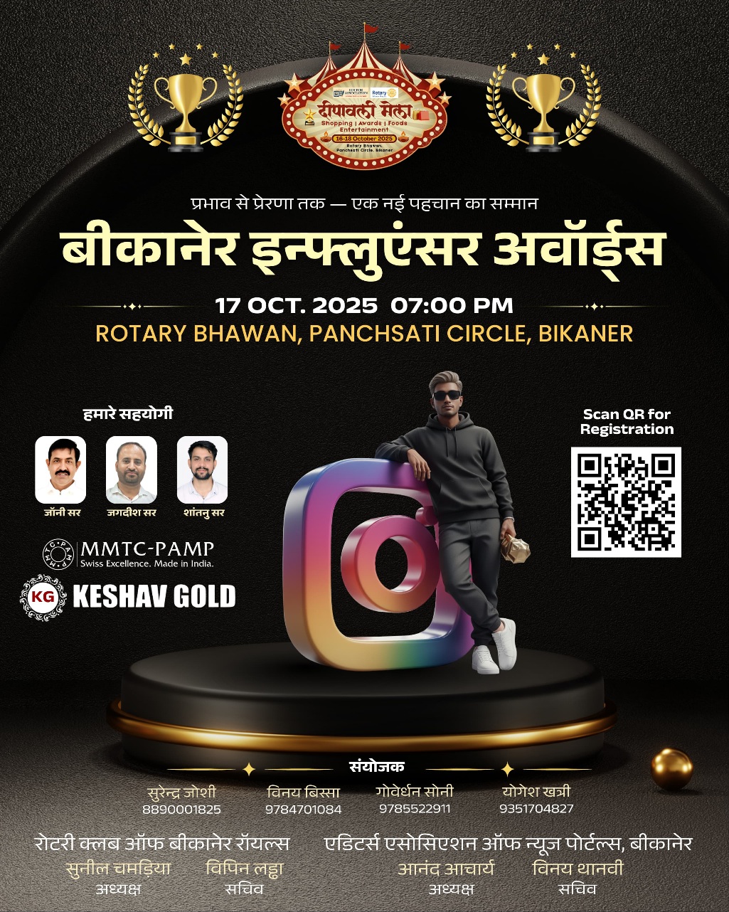 बीकानेर, 11 अक्टूबर। बीकानेर जैसे सांस्कृतिक और रचनात्मक शहर में आज अनेक युवा सोशल मीडिया और डिजिटल प्लेटफॉर्म के माध्यम से अपनी प्रतिभा का प्रदर्शन कर रहे हैं। ब्लॉगिंग, रील्स, वीडियो कंटेंट और ऑनलाइन क्रिएशन के जरिए ये युवा न केवल अपनी पहचान बना रहे हैं, बल्कि शहर की संस्कृति, समाज और व्यवसाय से भी गहराई से जुड़े हुए हैं। इन्हीं डिजिटल क्रिएटर्स को प्रोत्साहित करने और सम्मानित करने के उद्देश्य से बीकानेर में पहली बार “इन्फ्लुएंसर अवॉर्ड नाइट” का आयोजन किया जा रहा है।इस आयोजन के संयोजक रोटेरियन सुरेंद्र जोशी ने बताया कि यह कार्यक्रम रोटरी क्लब बीकानेर रॉयल्स एवं एडिटर एसोसिएशन ऑफ न्यूज पोर्टल्स के संयुक्त तत्वावधान में आयोजित होगा। यह अवॉर्ड नाइट 17 अक्टूबर को सायं 7 बजे रोटरी भवन, पंचशती सर्कल, बीकानेर में आयोजित की जाएगी। इस अवसर पर विभिन्न श्रेणियों में सक्रिय डिजिटल इन्फ्लुएंसरों को सम्मानित किया जाएगा, जिन्होंने अपने कंटेंट के माध्यम से समाज पर सकारात्मक प्रभाव डाला है और बीकानेर की डिजिटल पहचान को नई ऊंचाइयों तक पहुंचाया है।एडिटर एसोसिएशन के उपाध्यक्ष योगेश खत्री ने बताया कि इच्छुक इन्फ्लुएंसर या डिजिटल क्रिएटर निम्न श्रेणियों में आवेदन कर सकते हैं —बेस्ट एक्टर, बेस्ट सपोर्टिंग एक्टर, बेस्ट डायरेक्टर (शॉर्ट्स/रील/म्यूजिक वीडियो), बेस्ट सिनेमैटोग्राफी, बेस्ट ड्रामा/शॉर्ट फिल्म क्रिएटर, बेस्ट वॉइस ओवर आर्टिस्ट, बेस्ट क्रिएटिव वीडियो एडिटर, बेस्ट फोटोग्राफर (ट्रैवल, स्ट्रीट, पोर्ट्रेट), बेस्ट फैशन एंड लाइफस्टाइल इन्फ्लुएंसर, बेस्ट कल्चर एंड हेरिटेज ब्लॉगर, बेस्ट फूड ब्लॉगर, बेस्ट ट्रैवल और इवेंट ब्लॉगर, बेस्ट न्यूज ब्लॉगर या डिजिटल जर्नलिस्ट, बेस्ट आरजे/पॉडकास्ट ऑन सोशल मीडिया, बेस्ट हेल्थ एंड वेलनेस क्रिएटर, बेस्ट मोटिवेशनल एंड एजुकेशनल क्रिएटर, बेस्ट सोशल अवेयरनेस कैंपेन, बेस्ट टीम कोलैबोरेशन, राइजिंग स्टार ऑफ द ईयर, मोस्ट इंपैक्टफुल इन्फ्लुएंसर, पब्लिक चॉइस अवॉर्ड, लाइफटाइम अचीवमेंट इन डिजिटल मीडिया, जिला प्राइड अवॉर्ड (मीडिया के माध्यम से सामाजिक योगदान हेतु), जूरी स्पेशल मेंशन और मिसलेनियस कैटेगरी।रोटेरियन विनय बिस्सा ने बताया कि आवेदन प्रक्रिया पूरी तरह ऑनलाइन है। प्रतिभागी निम्न लिंक के माध्यम से 15 अक्टूबर की रात 12 बजे तक आवेदन कर सकते हैं —🔗 https://forms.gle/b6cbxNrAwW9GC3DXAएडिटर एसोसिएशन के उपाध्यक्ष गोवर्धन सोनी ने बताया कि चयन प्रक्रिया आवेदन और जूरी सिलेक्शन के संयुक्त आधार पर होगी। चयनित प्रतिभाओं को दीपोत्सव कार्यक्रम के मंच पर सम्मानित किया जाएगा।अधिक जानकारी के लिए संपर्क करें —📞 रोटेरियन सुरेंद्र जोशी (8890001825), रोटेरियन विनय बिस्सा (9784701084), गोव